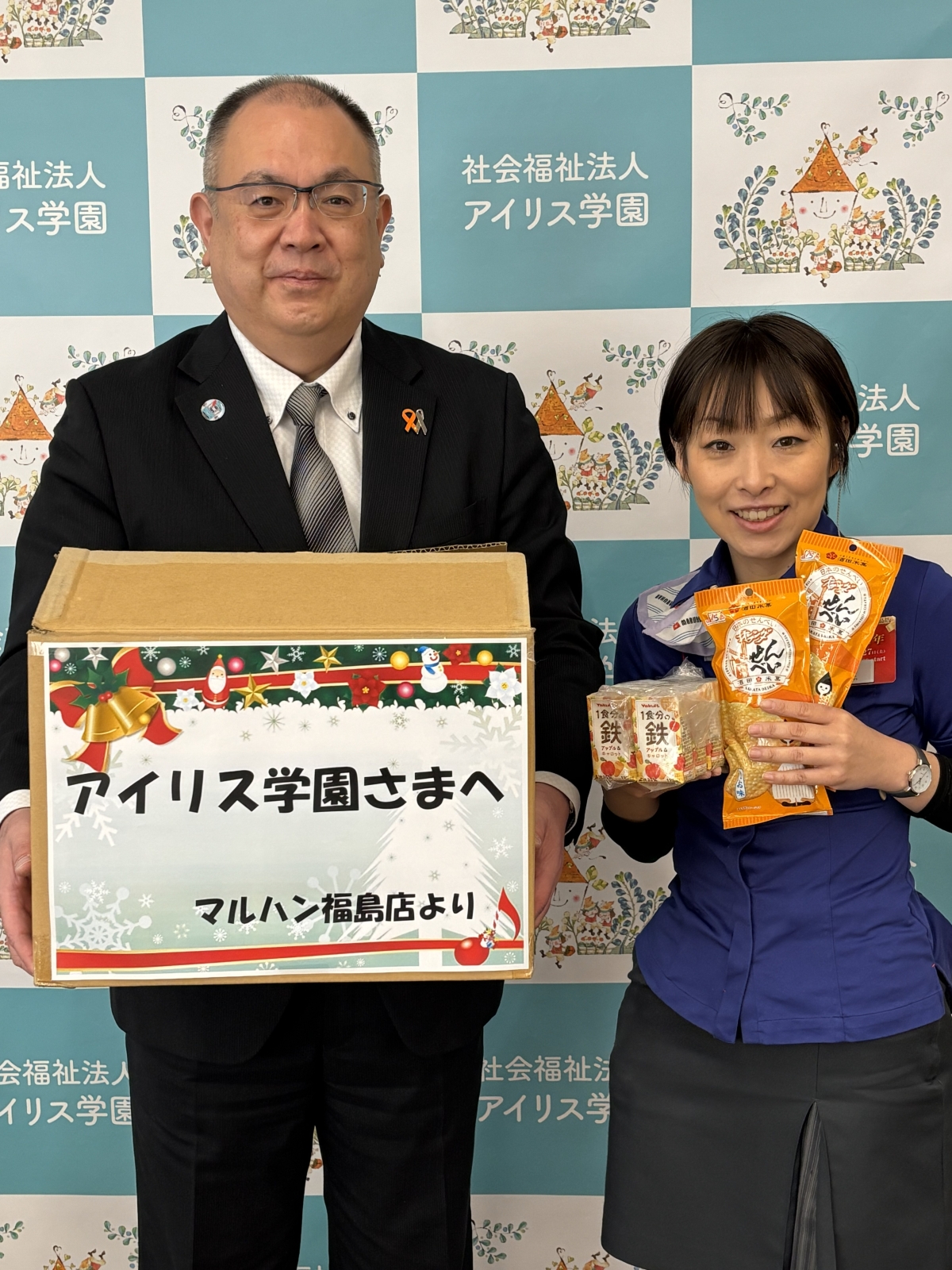 令和7年12月23日(火)「マルハン福島店」様より、こども達へお菓子と生活用品の寄贈をいただきました。今日は公立小中学校の終業式、いよいよ明日から冬休み&クリスマス会が予定されています。いつも「勉強は?」とか嫌なことばかりこども達や先生方に言っている園長ですが、この期間ばかりはせっかく寄贈いただいたお菓子を頬張り、ジュースを飲みながら楽しいクリスマス、お正月の思い出を先生方と一緒に作ってほしいなあと思っています。