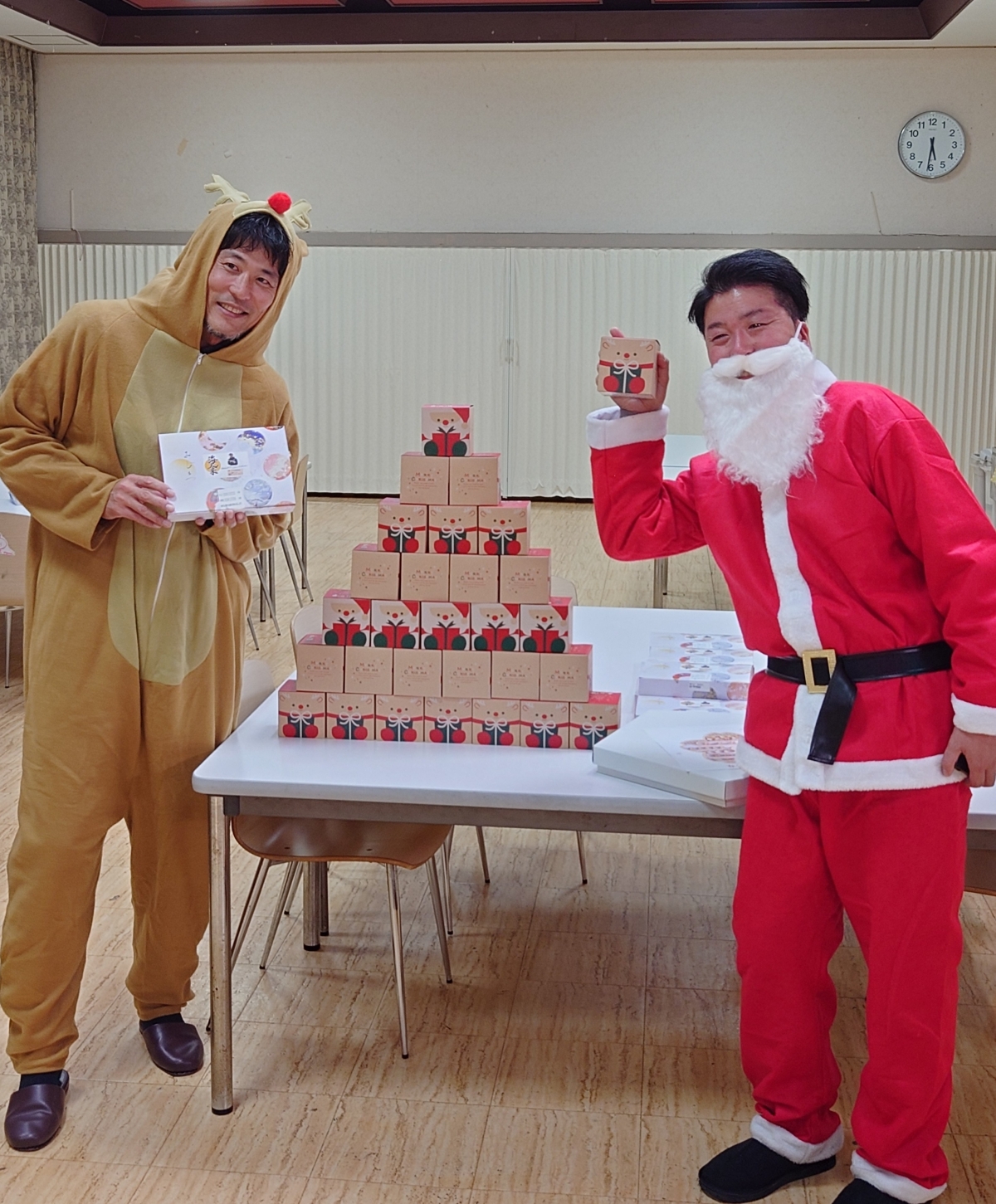 令和7年12月22日(月)すっかり日も暮れた、アイリス学園近くの天戸川沿いの道をなぜかサンタさんが運転し、助手席にはイケメン!?のトナカイが乗ったワゴン車が1台(ボディには「いもくり佐太郎」というロゴ入り)、その後ろに続く、こちらもサンタさんの帽子をかぶった女性の一行の普通車が1台、吾妻おろしの寒風の中でも、クマ出没注意地域であっても、用心深くも気持ちよく進みながら、こども達の待ち構える学園入口に滑り込んできました。
