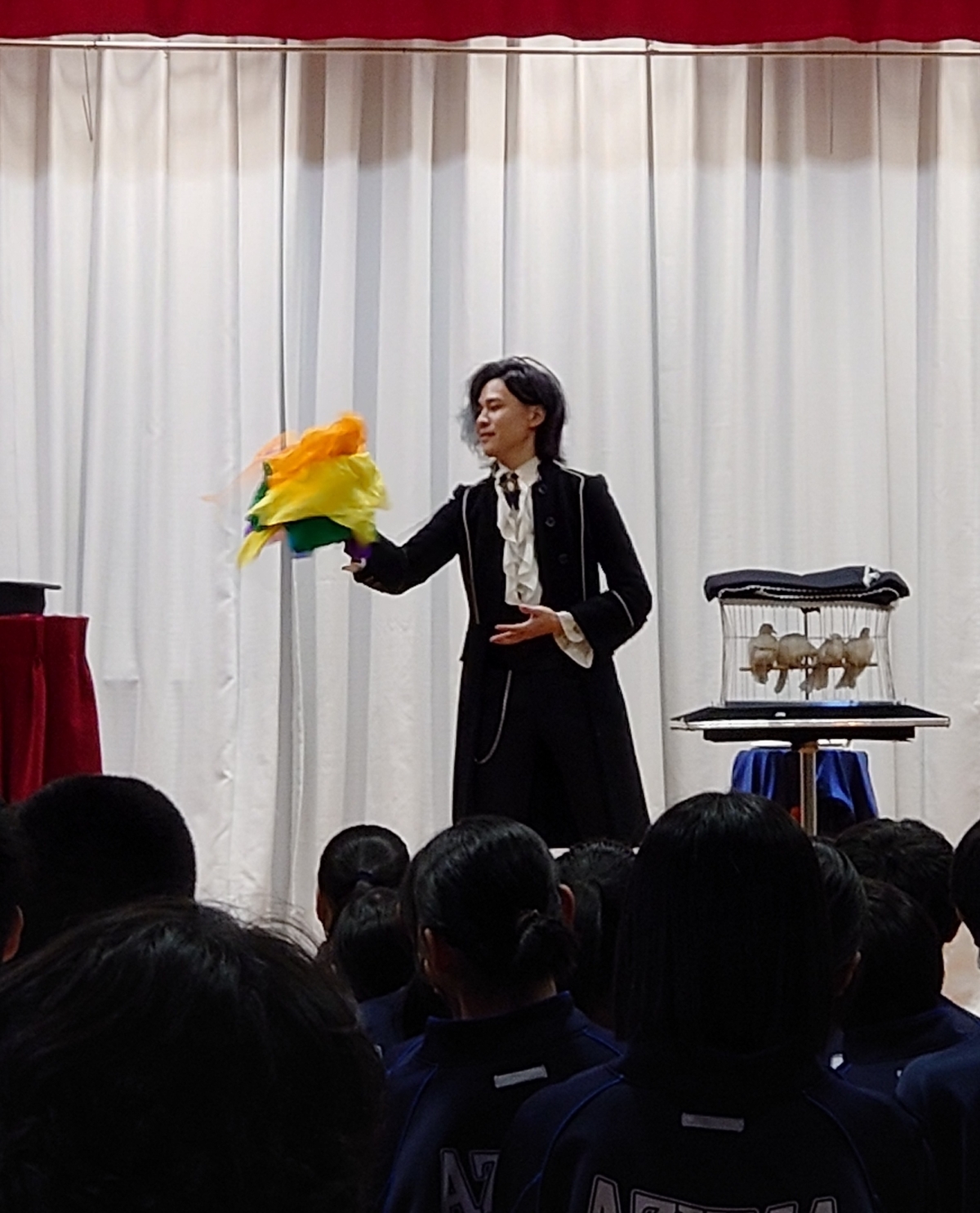 11/4(火)吾妻中学校でPTA主催の「教養講座」が開催されました。希望する保護者も参加可能ということでお邪魔してきました。講師は先日このコーナーでも紹介しましたアイリス学園の応援団でプロマジシャンの空先拓海さん、「夢の叶え方~人はいつでもかわることができる~」トーク&マジックショーという演題での登壇でした。